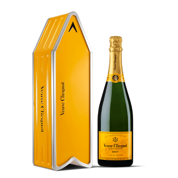 Champagne Veuve Clicquot Brut Yellow Label Arrow. La presentación de la botella es de 750 ml en una caja que está elaborada sin plásticos, siendo más sostenible.