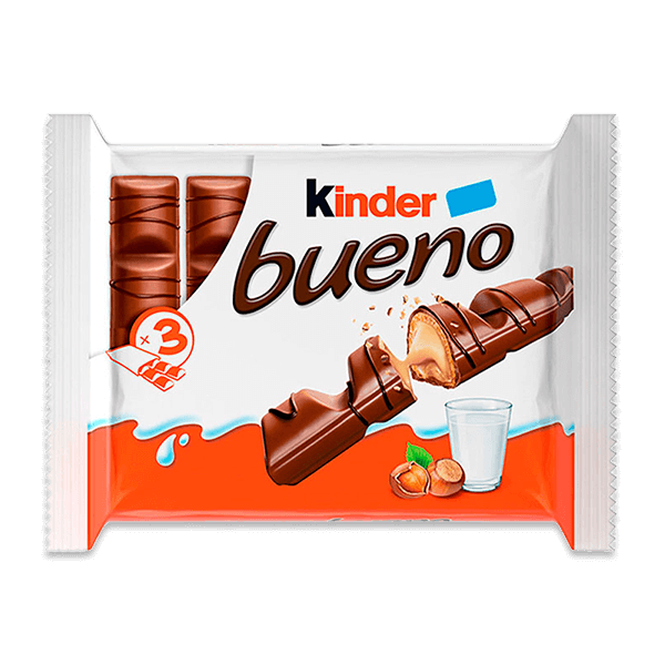 El Kinder Bueno es una barra wafer recubierta de chocolate lechoso con relleno cremoso a base de leche y avellanas. Se pueden consumir a cualquier hora del día como aperitivo o snack. País: Francia.