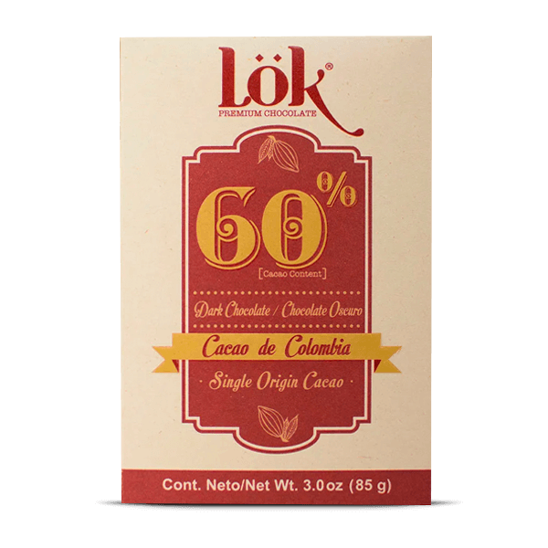 Chocolate Lok 60% Origen Colombia; Es la combinación perfecta entre sabores frutales cítricos y frutos rojos. Su sabor es especial y resalta los aromas y sabores típicos del cacao colombiano. Ideal para acompañar con un buen café, maridajes con vino tinto e infaltable a la hora de combinarlo con frutos secos como avellanas y almendras.