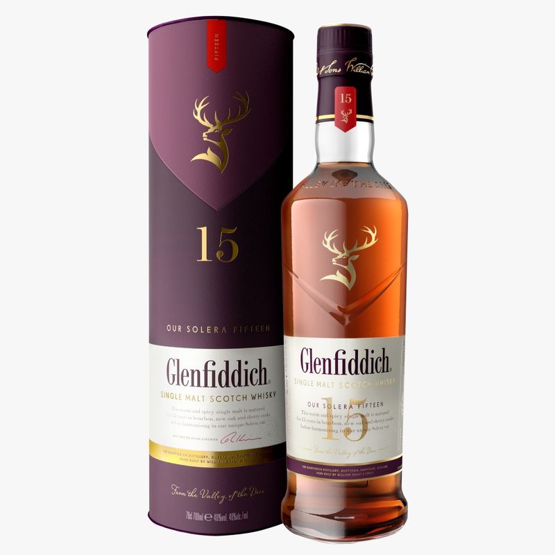 El Glenfiddich 15 años se trata del whisky escocés de una sola malta añejado en roble americano nuevo, roble americano y roble europeo; de este modo libera, poco a poco, los sabores de las barricas vírgenes. Suavizado con nuestro primer y único proceso conocido como Solera Vat y maridado en tinas de roble portuguesas.
